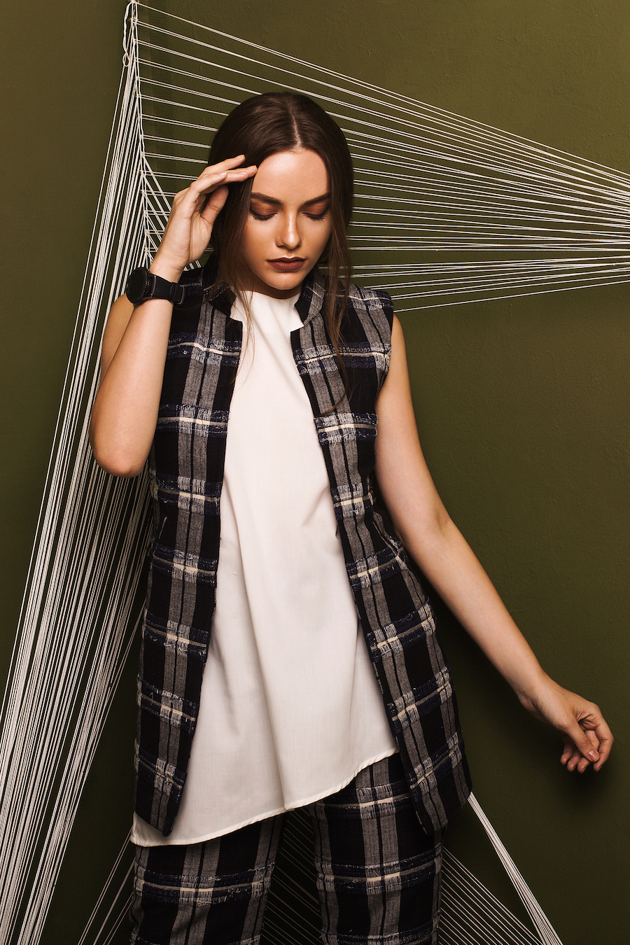 A hand woven vest mixed with premium black neoprene with welt pocket and back belt details