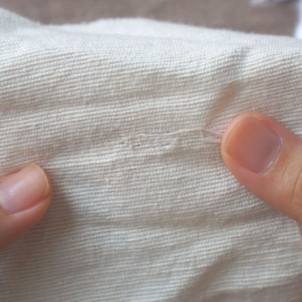 Step 4. To weave, you may start with warp. After you have done warp over the hole/torn part, you can continue to do weft. Please be aware that in weaving, the weft has to go over then under the warp. If you start the first row of weft by going over the warp, the following row must go under the warp. Then repeating the same process by going under and over and so on.